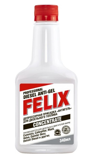 Присадка в дизельное топливо антигель FELIX 340 мл – это депрессорная присадка нового поколения, предназначенная для добавления в дизельное топливо с целью стабилизации работы двигателя в широком диапазоне климатических условий. Антигель FELIX воздействует на углеводороды парафиновой группы и растворенную в топливе воду, значительно снижая температуру фильтруемости и замерзания дизельного топлива. Рассчитан на 250-500 литров топлива в зависимости от выбранной температуры фильтруемости.