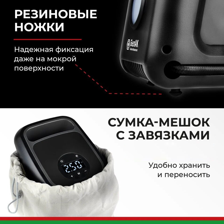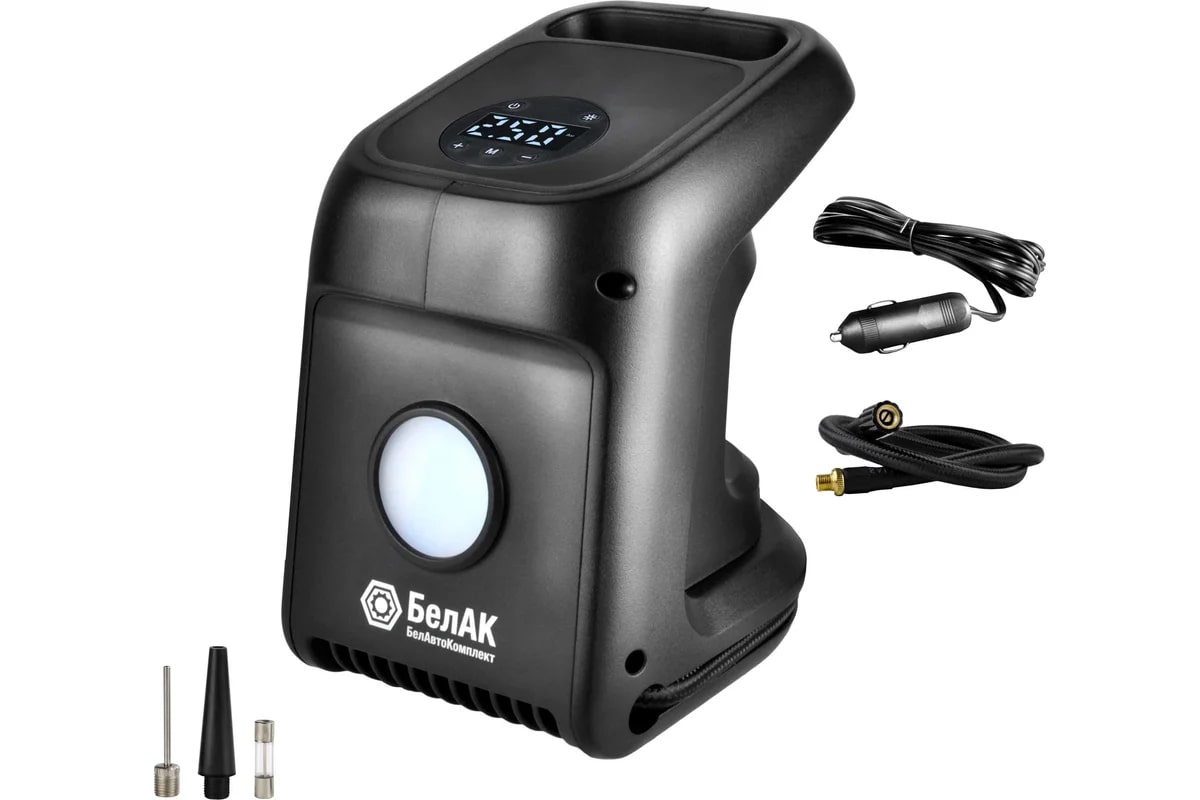 - Мощный светодиодный фонарь: позволяет безопасно использовать компрессор в темное время суток и расширяет диапазон его применения.