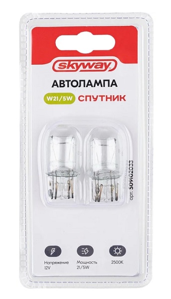 Лампа галогенная автомобильная W21/5W 12V 21/5W, W3x16q 2-конт 440/35Лм 2500К СПУТНИК SKYWAY, (2 шт)