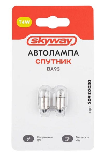 Лампа накаливания автомобильная T4W 12V 4W, ВА9s 1-конт 35Лм 2500К СПУТНИК SKYWAY, (2 шт)