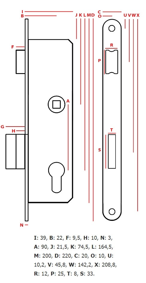 Замок-защелка с отверстием для евроцилиндра и отверстием для ручки