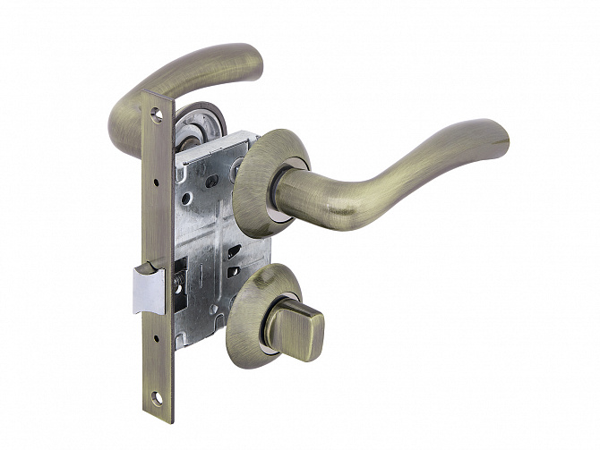 Комплектация: дверные ручки на квадратной розетке (2 шт.), межкомнатный замок-защелка, ответная планка, накладка-завертка, квадрат 8x8 мм, квадрат 6x6 мм, шестигранник, стяжные винты (4 шт.), шурупы (16 шт.).
