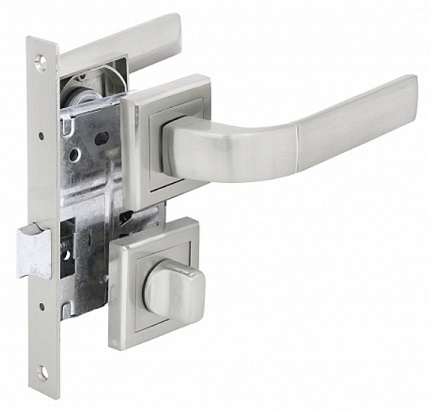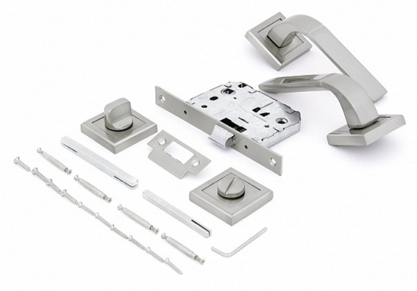 Комплектация: дверные ручки на квадратной розетке (2 шт.), межкомнатный замок-защелка, ответная планка, накладка-завертка, квадрат 8x8 мм, квадрат 6x6 мм, шестигранник, стяжные винты (4 шт.), шурупы (16 шт.).