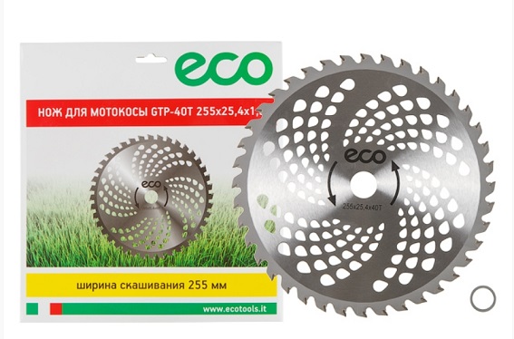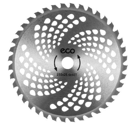 Нож для мотокосы 255х1.3х25.4 мм, 40 зубьев ECO GTP-40T - представляет собой твердосплавный диск с победитовыми напайками из высококачественной стали. Благодаря дополнительным отверстиям по всей ширине ножа, снижается нагрузка на редуктор мотокосы при работе. Применяется для кошения жёсткой травы, кустарника, молодых побегов деревьев.