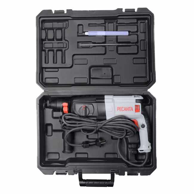 Перфоратор Ресанта П-32-1000К имеет мощность 900 Вт и энергию удара 3,2 Дж, что позволяет легко справляться с твердыми материалами, такими как бетон и кирпич. Способен бурить отверстия диаметром до 30 мм в бетоне с частотой вращения 0-1100 об/мин. Наличие предохранительной муфты повышает безопасность работы, предотвращая повреждения инструмента и травмы пользователя в случае заклинивания сверла. Кабель питания длиной 3 м предоставляет свободу движений и удобство при работе.