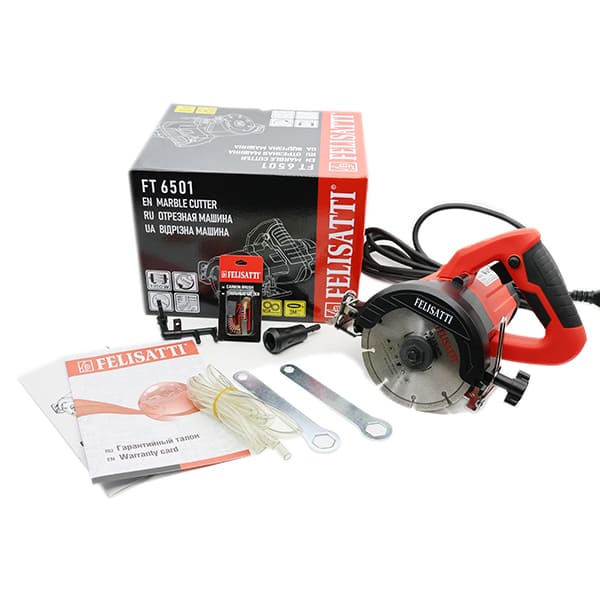 Отрезная машина FT6501 Felisatti Алмазная пила FT6501 с диаметром круга 125 мм обеспечивает высокую производительность благодаря мощности 1350 Вт и частоте вращения до 13 500 об/мин. Это идеальный выбор для точных и аккуратных резов различных твердых материалов — бетонных поверхностей, природного камня и керамической плитки. FT6501 — надежный и мощный инструмент для профессиональной и бытовой резки, обеспечивающий высокое качество и комфорт в работе.