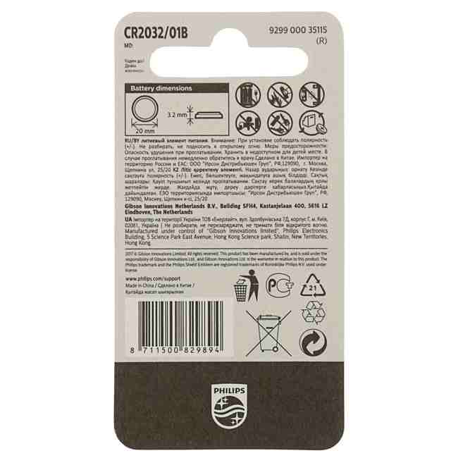 Элемент питания (батарейка) литиевый Philips CR2032-1BL
