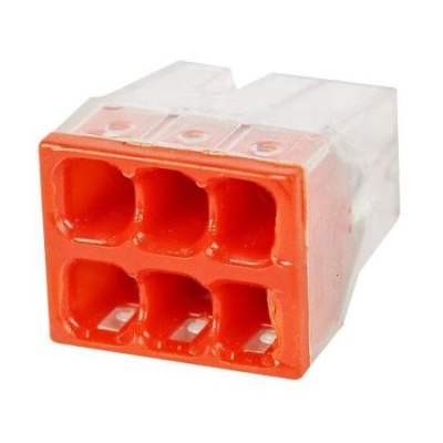 Строительно-монтажная клемма СКМ EU2.5-426 6 отверстий (0.5-2.5мм²), HLT для присоединения и ответвления одножильных проводников одножильных и многожильных проводников сечением до 2,5 мм² в цепях переменного тока до 400 В.