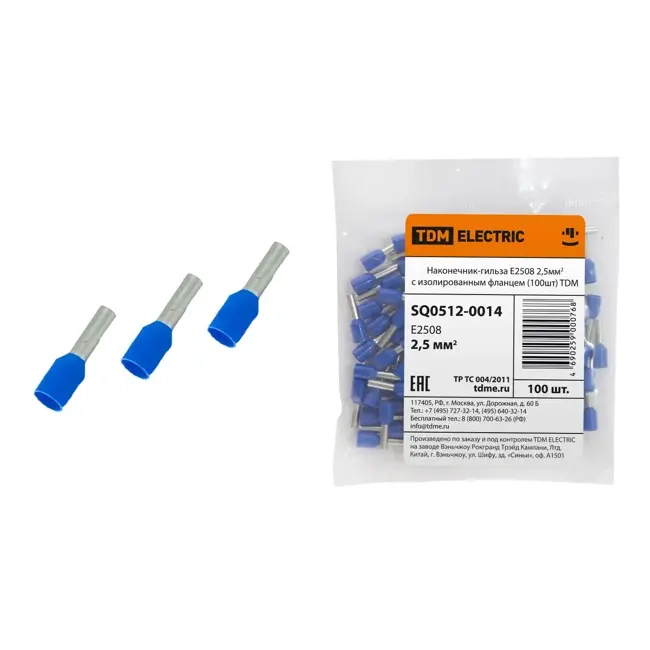 Наконечник-гильза Е2508 2.5 мм² с изолированным фланцем TDM SQ0512-0014 - лучший помощник для оконцевания проволочных гибких кабелей и подсоединения их к контактным клеммам различного электрооборудования. Край многопроволочного провода заводится внутрь пустотелой концевой трубки и далее опрессовывается вместе с трубкой с применением специального инструмента, составляя совместную конструкцию, надежно скрепляющую пучок многопроволочной жилы.