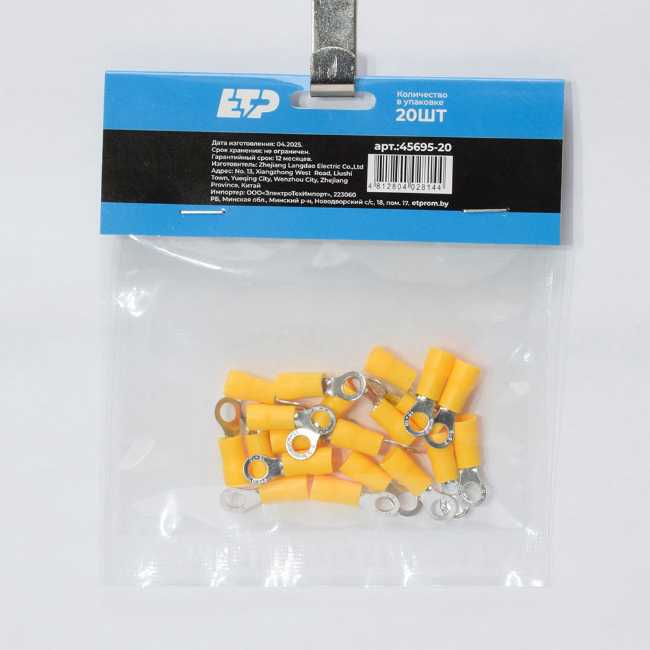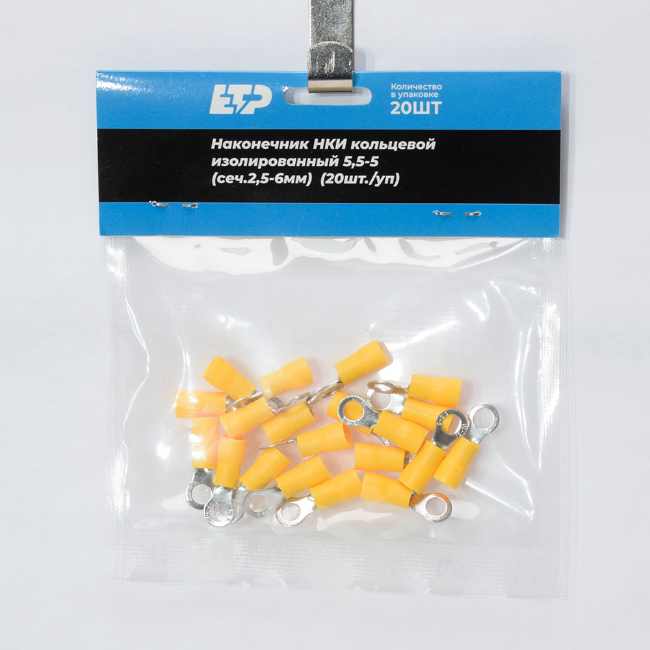 Наконечник кольцевой изолированный НКИ 5.5-5 желтый 20 шт. ETP 45695-20 предназначен для оконцевания методом опрессовки гибких многопроволочных медных проводников. Изоляция наконечника изготовлена из полипропилена не поддерживающего горения, а контактная часть из высококачественной меди. Наконечник предназначен для крепления к клеммам электрического оборудования на основе винтовой фиксации.