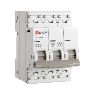 Автоматический выключатель ВА 47-63N3P 20А C 4.5кА EKF PROxima M634320C для оперативных включений и отключений в электрических сетях переменного тока, а также защиты от токов перегрузки и коротких замыканий в жилых и общественных сооружениях.