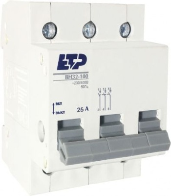Выключатель нагрузки ВН32-100 3P 25А ETP. Выключатели нагрузки ВН 32-100 ETP предназначены для оперативного управления участками электрических цепей, т.е. управляют процессом включения-выключения номинальных токов в отходящей цепи. Выключатели нагрузки ВН 32-100 ETP выполнены в корпусе из не поддерживающей горение пластмассы. Насечки на контактных зажимах предотвращают перегрев и оплавление проводов за счет более плотного и большего по площади контакта. На лицевой панели реализован механический индикатор положения контактов (включено/отключено). Эргономичная рукоятка управления исключает соскальзывание пальцев. Геометрия боковых поверхностей изделия разработана для улучшения теплового режима.