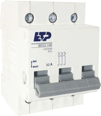 Выключатель нагрузки ВН32-100 3P 32А ETP. Выключатели нагрузки ВН 32-100 ETP предназначены для оперативного управления участками электрических цепей, т.е. управляют процессом включения-выключения номинальных токов в отходящей цепи. Выключатели нагрузки ВН 32-100 ETP выполнены в корпусе из не поддерживающей горение пластмассы. Насечки на контактных зажимах предотвращают перегрев и оплавление проводов за счет более плотного и большего по площади контакта. На лицевой панели реализован механический индикатор положения контактов (включено/отключено). Эргономичная рукоятка управления исключает соскальзывание пальцев. Геометрия боковых поверхностей изделия разработана для улучшения теплового режима.