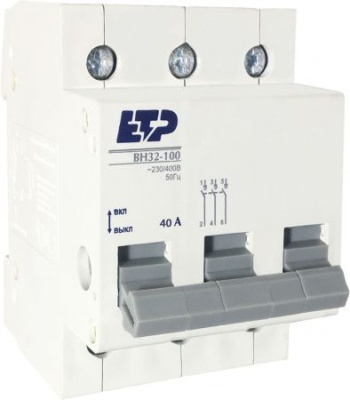 Выключатель нагрузки ВН32-100 3P 40А ETP. Выключатели нагрузки ВН 32-100 ETP предназначены для оперативного управления участками электрических цепей, т.е. управляют процессом включения-выключения номинальных токов в отходящей цепи. Выключатели нагрузки ВН 32-100 ETP выполнены в корпусе из не поддерживающей горение пластмассы. Насечки на контактных зажимах предотвращают перегрев и оплавление проводов за счет более плотного и большего по площади контакта. На лицевой панели реализован механический индикатор положения контактов (включено/отключено). Эргономичная рукоятка управления исключает соскальзывание пальцев. Геометрия боковых поверхностей изделия разработана для улучшения теплового режима.