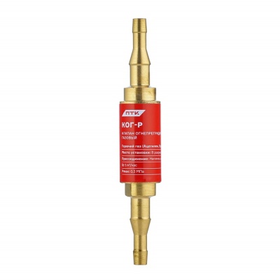 Клапан огнепреградительный в разрыв рукава (горючий газ) - предназначен для защиты от противотока газа, а также для защиты от разрыва газового резинотканевого рукава и его возгорания при обратном ударе пламени. Клапан устанавливается в разрыв рукава. Присоединяется при помощи универсального ниппеля диаметром 6 и 9 мм. Основное преимущество клапана – задержка противотока газа при давлении от 0,03 кгс/см2 и более. Направление истечения газа указано стрелкой на наклейке.