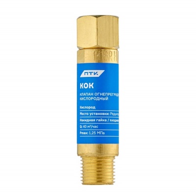 Клапан огнепреградительный на редуктор (кислород) М16х1,5 - предназначен для защиты от противотока газа, а также для защиты от разрыва кислородного резинотканевого рукава и его возгорания при обратном ударе пламени. Клапан устанавливается на редуктор. Присоединение - накидная гайка/входная резьба М16х1,5. Основное преимущество клапана – задержка противотока газа при давлении от 0,03 кгс/см2 и более. Направление истечения газа указано стрелкой на наклейке.