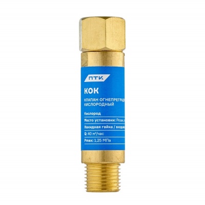 Клапан огнепреградительный на резак (кислород) М16х1,5 - предназначен для защиты от противотока газа, а также для защиты от разрыва кислородного резинотканевого рукава и его возгорания при обратном ударе пламени. Клапан устанавливается на резак или горелку. Присоединение - накидная гайка/входная резьба М16х1,5. Основное преимущество клапана – задержка противотока газа при давлении от 0,03 кгс/см2 и более. Направление истечения газа указано стрелкой на наклейке.