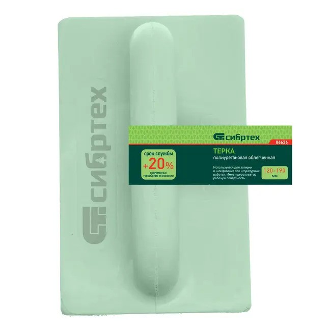 Тёрка полиуретановая 120x190 мм облегченная СИБРТЕХ 86636 для затирки и шлифования при штукатурных работах. Имеет шероховатую рабочую поверхность.