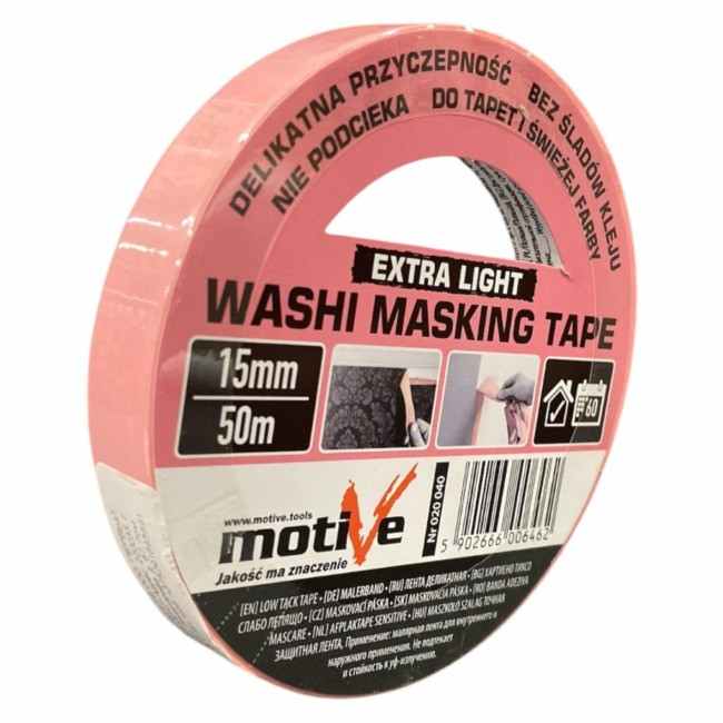Лента малярная WASHI EXTRA LIGHT из рисовой бумаги 15мм 50м MOTIVE 020040 деликатная предназначена для малярных и ремонтных работ.