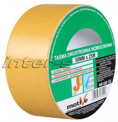 Скотч двусторонний 50ммх5м на тканевой основе (020120) INTERS - двухсторонняя лента на тканевой основе. Обладает высокой степенью прочности и адгезии. Устойчива к разрыву. Рекомендуется для грубых подложек.