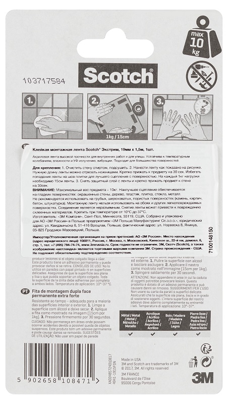 - Максимальная нагрузка: 2 кг на 30 см ленты (Нагрузка рассчитана при идеально ровной поверхности соприкосновения.)