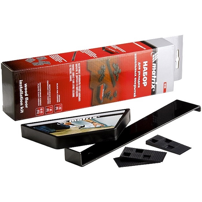 Набор для укладки напольных покрытий, Matrix 88100 используется для правильной укладки напольных покрытий. С его помощью можно гораздо быстрее установить ламинат и при этом получить качественный результат без дефектов и повреждений. Набор включает все необходимое для монтажа: брусок, скобу и распорные клинья. Клинья обеспечивают точность выравнивания первого ряда и возможность регулировки зазора между панелями и стеной. Скоба позволяет подбить последний ряд для плотной усадки. Брусок защищает замок панелей, если нужно подбить стыки молотком.