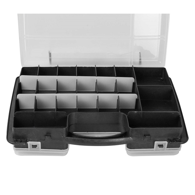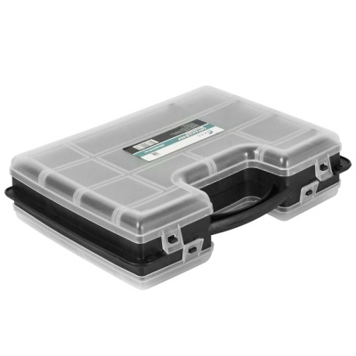 Ящик для крепежа (органайзер) двусторонний 12" (295х220х76 мм), SPEC выполнен в форме кейса, переставные перегородки, на одной стороне 22 отделения, на другой - 10 отделений. Служит для хранения и переноски крепежных и других мелких изделий. В нем удобно размещаются необходимые аксессуары и различные мелочи. Прозрачная крышка позволяет видеть расположение крепежа внутри.
