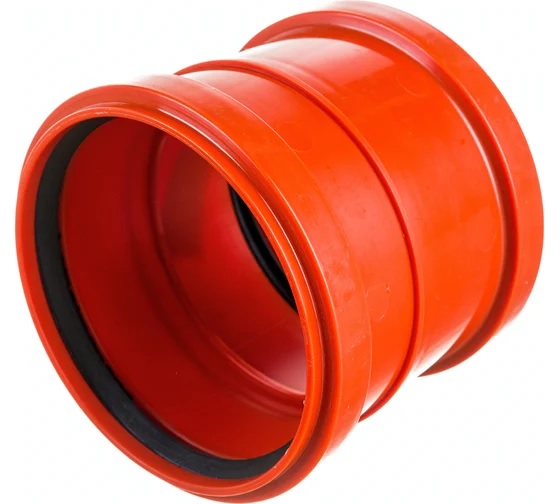 Муфта двухраструбная применяется для соединения безраструбовых концов труб в системах наружной канализации. Широко используется в ремонтных работах. Имеет перемычку на внутренней поверхности. В качестве уплотнителей используются резиновые кольца манжетного типа.