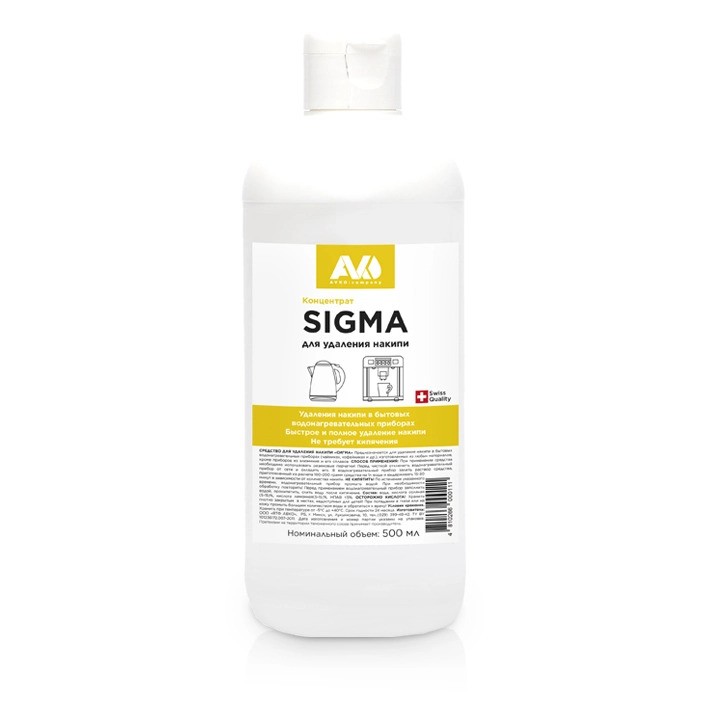 Средство для удаления накипи "Сигма" 0,5л. AVKO - СИГМА предназначается для удаления накипи с бытовых водонагревательных приборов (чайников, кофейников и др), изготовленных из любых материалов, кроме приборов из алюминия и его сплавов.