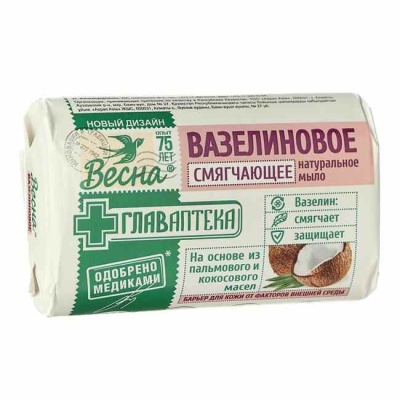 Мыло туалетное твердое 90г вазелиновое Весна с добавлением вазелинового масла специально рекомендовано для сухой кожи. Смягчает ее, делает нежной и эластичной. Глицерин — один из самых эффективных натуральных увлажнителей. Вазелиновое масло обладает защитными, регенерирующими и смягчающими свойствами, предохраняет кожу от пересушивания.