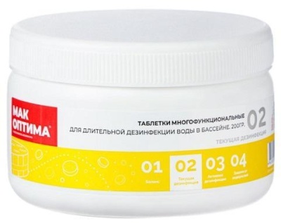Комплексный препарат для дезинфекции МАК 4 10087 2 таблетки по 200 гр используется для дезинфекции воды в бассейне. Подходит для семейных и детских бассейнов (INTEX , BESTWAY и др.). Препарат максимально прост в использовании. Основной элемент в препарате: стабилизированный хлор. Дополнительные элементы : - альгицид ( уничтожение водорослей) ; - флокулянт ( собирает мелкие частицы загрязнений в крупные, тем самым увеличивается эффективность механической фильтрации). Рассчитан на 6-8 недель использования, в зависимости от объёма бассейна.