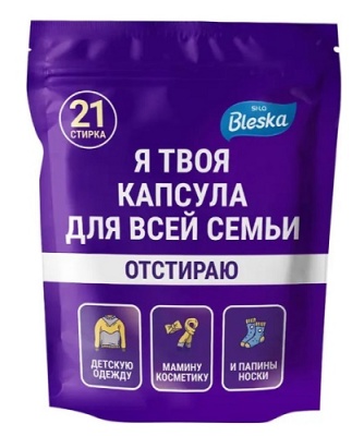 Капсулы для стирки Bleska помогут справиться с любыми видами загрязнений. Подходят для стирки всех видов тканей (кроме шерсти и шёлка). Эффект кондиционирования делает вещи мягкими и придаёт им приятный ягодный аромат. Перед использованием ознакомьтесь с инструкцией и мерами предосторожности на упаковке. Внутри 21 капсула.