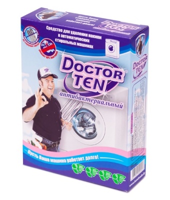 Средство для удаления накипи в автоматических стиральных машинах с антибактериальным эффектом Doctor Ten, 200 г - кроме свойств обычного Doctor Ten, содержит компоненты уничтожающие до 99% вредных для человека бактерий, а при регулярном использовании способен предотвращать появление грибковых образований и черной плесени не только в моющей полости стиральной машины, но и в трубопроводе, устраняя неприятные запахи и дезинфицируя даже скрытые полости стиральной машины.