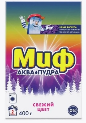 Порошок стиральный Миф автомат Cвежий цвет, 0.4 кг для стирки цветного белья всей семьи. Порошок проникает в волокна ткани, эффективно удаляет даже самые трудновыводимые пятна, при этом сохраняет яркость цвета и оставляет приятный аромат и длительную свежесть. Средство для стирки «Миф» можно использовать как для стиральной машины, так и для ручной стирки.