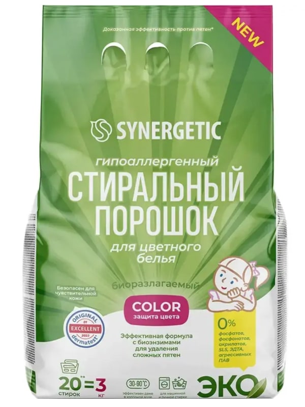 Порошок стиральный для цветного белья SYNERGETIC гипоаллергенный 3кг обеспечивает сияющую чистоту тканей без разводов, устраняя неприятные запахи и придавая свежий аромат.