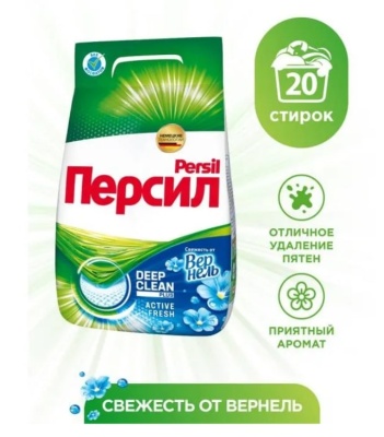 Порошок стиральный Persil Свежесть от Vernel, 3 кг для белого белья - это порошок для стирки с формулой Deep Clean Technology, которая обладает уникальным сочетанием 13 активных компонентов. Стиральный порошок Persil - это всё, что нужно для сияющей чистоты белья. Порошок для стирки белья Persil содержит защиту от образования известкового налета для жесткой и мягкой воды. Стиральный порошок Persil обладает следующими преимуществами - Отличное удаление пятен, - Яркость цвета и забота о ткани, - Незабываемая свежесть от Vernel надолго. Порошок для стирки белья Persil – комплексное решение в одном средстве для отличного результата стирки белых и светлых вещей. Стиральный порошок для стирки белых и светлых изделий из хлопчатобумажных, льняных, синтетических тканей и тканей из смешанных волокон в стиральных машинах-автоматах и ручной стирки. Используйте специальный порошок для стирки для изделий из шерсти и шелка. Белое белье стирайте отдельно от цветного.