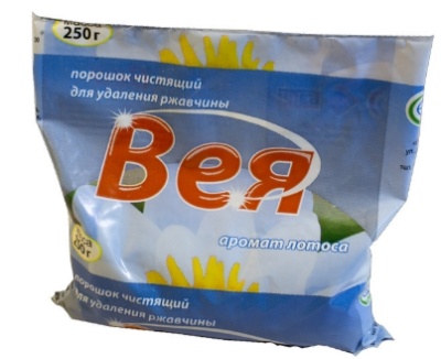 Порошок чистящий для удаления ржавчины "Вея" 0,25 кг Специальное средство предназначено для удаления пятен ржавчины, известкового налета, мыльных осадков и подтеков, водного камня, устойчивых загрязнений с фаянсовых, фарфоровых и кафельных поверхностей в ванной комнате, душе и на кухне. Удаляет пятна ржавчины и мочевой камень в унитазах.