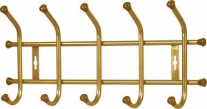 Вешалка настенная металлическая NIKA ВНТ5/З имеет габаритные размеры 850х495х215 мм. Каркас из стальной трубы с порошковым покрытием устойчив к механическим воздействиям. Допустимая нагрузка на крючок не более 5 кг, а на само изделие не более 20 кг. Цвет — золото.
