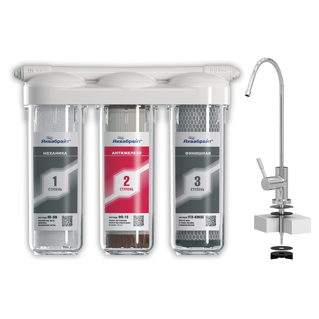 Система АКВАБРАЙТ АБФ-ТРИА АНТИЖЕЛЕЗО укомплектована отдельным краном под кухонную мойку, удобным шаблоном для крепления системы на стену и комплектом для подкючения системы к водопроводу.