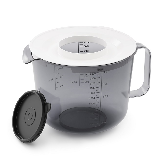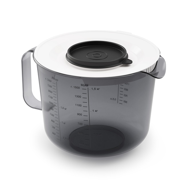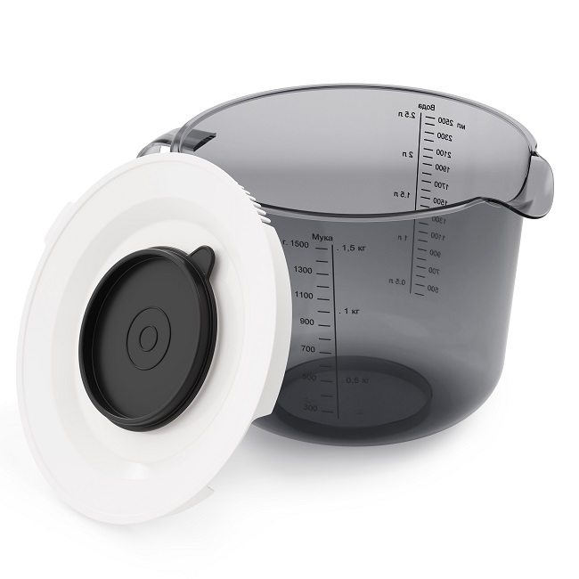 Ёмкость предназначена для приготовления теста, кремов, коктейлей, фруктово-ягодных муссов и других блюд. Взбивание продуктов можно осуществлять как миксером, так и блендером. Процесс приготовления становится комфортным благодаря специальной крышке, защищающей от разбрызгивания. В ёмкости легко хранить уже готовые коктейли, достаточно лишь закрыть отверстие дополнительной мягкой крышкой, защищающей продукты от заветривания. Эта центральная крышка, надетая во время работы миксера на дно, дарит ёмкости противоскользящий эффект. Для удобного слива содержимого на ёмкости имеется эргономичная ручка и носик. Мерная шкала даёт возможность использования изделия и в качестве мерного стакана.
