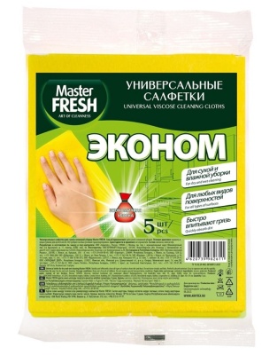 Салфетки универсальные для сухой и влажной уборки (5 шт), Master FRESH для уборки из вискозы позволяют быстро и качественно очистить от грязи и пыли все виды поверхностей, не оставляя разводов и ворсинок. Отлично впитывают влагу, легко выжимаются и быстро сохнут.