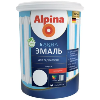 Эмаль акриловая для радиаторов Alpina Aqua, глянцевая 0,9 л обладает высокой кроющей способностью, создает абсолютно белую и не желтеющую, стойкую к царапинам глянцевую поверхность. Практически без запаха при нанесении и высыхании. На водной основе. Легко наносится, быстро сохнет, отлично моется и чистится, термостойкая до 100°C.