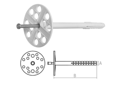 Дюбель для теплоизоляции 10x120мм с металлич. гвоздем БАРТЕР - Дюбель предназначен для крепления теплоизоляционных материалов. Используется в качестве механического крепления пенополистирола, минеральной ваты, слоистых плит к бетонным основаниям и другим материалам. Гвоздь выполнен из металла, который отличается прочностью, долговечностью и устоичивостью к коррозии.