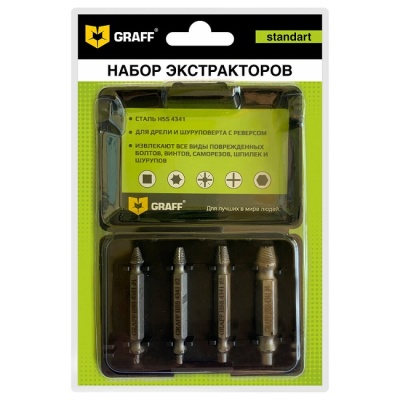 Бита TX 20x25 мм ( 2 шт.), GRAFF. Экстракторы - это инструмент (приспособление), которое используются для извлечения всех видов заломанных (сломанных), поврежденных болтов, винтов, саморезов, шпилек и шурупов и являются незаменимым инструментом для тех, кому постоянно приходится работать с резьбовыми соединениями. Изготовлены из высококачественной быстрорежущей стали HSS 4341. Применяются в дрелях и шуруповертах с реверсом. Набор продается в пластиковом кейсе для удобства хранения. Экстракторы подходят как для бытового, так и для профессионального использования.