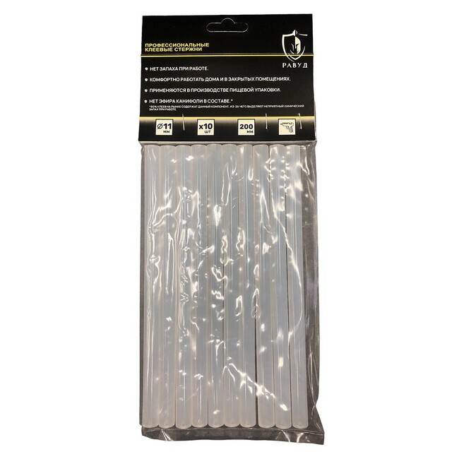 Клеевые стержни 11х200мм прозрачные 10шт РАВУД 11200-10 используются в качестве расходных материалов для клеевых пистолетов калибра 11 мм. Они обеспечивают качественное и надежное сцепление различных материалов: бумаги, пластика, дерева, керамики, электрических плат и т.д. Также их можно использовать для герметизации швов и трещин.