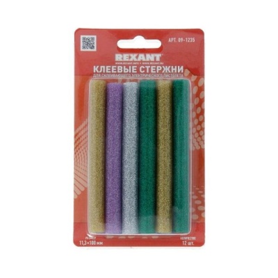 Клеевые стержни 11.3 x 100 мм (12 шт) цветные с блёстками, REXANT 09-1235 предназначен для склеивания разных поверхностей в любом сочетании из дерева, пластмассы, картона, бумаги, металла, керамики и т. д. Для склеивания потребуется всего 40-60 секунд, после чего возможно приступить к использованию склеенных предметов. Удобство использования - достаточно зарядить стержни в клеевой пистолет и поверхности будут склеены всего одним нажатием на курок. Экологичность - термоклей состоит из смолы ЭВА, которая нетоксична, не выделяет запаха и не содержит растворителей. Это позволит пользоваться термоклеем даже аллергичным людям.
