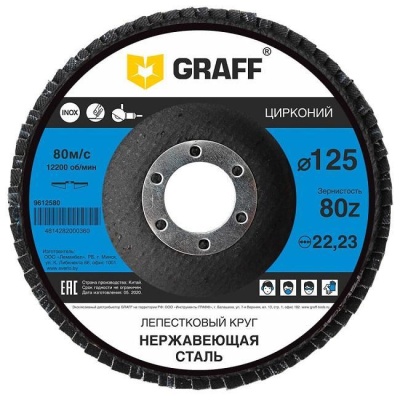 Круг лепестковый по нержавеющей стали 125x22.23 мм 80Z GRAFF на бакелитовой связке для шлифования нержавеющего металла, сварных швов, дерева, пластика и других поверхностей при помощи болгарки. Зерно из циркония идеально подходит для обработки как обычного так и нержавеющего металла и имеет повышенную износостойкость при шлифовании по сравнению с зерном из оксида алюминия. Очень прочное соединение лепестков из наждачной шкурки с основанием из стекловолокна, при помощи эпоксидного клея, обеспечивает повышенную износостойкость и устойчивость к отрыву лепестков. Максимальная скорость вращения 80 м/с или 12 200 об/мин.