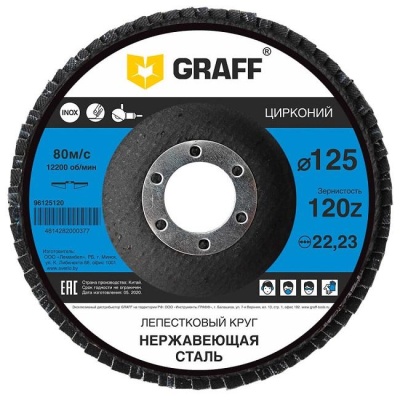 Круг лепестковый по нержавеющей стали 125x22.23 мм 120Z GRAFF на бакелитовой связке для шлифования нержавеющего металла, сварных швов, дерева, пластика и других поверхностей при помощи болгарки. Зерно из циркония идеально подходит для обработки как обычного так и нержавеющего металла и имеет повышенную износостойкость при шлифовании по сравнению с зерном из оксида алюминия. Очень прочное соединение лепестков из наждачной шкурки с основанием из стекловолокна, при помощи эпоксидного клея, обеспечивает повышенную износостойкость и устойчивость к отрыву лепестков. Максимальная скорость вращения 80 м/с или 12 200 об/мин.
