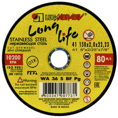 Круг отрезной 150х2.0x22.2 мм для нержавеющей стали LUGA Long Life