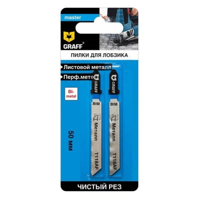 Пилки для лобзика 110 мм по металлу T318BF Bi-metal (2 шт.), GRAFF, Пилки для лобзика 50 мм по дереву T101AO HCS (2 шт.), GRAFF, Пилки для лобзика 110 мм по металлу T318A HSS (2 шт.), GRAFF, Пилки для лобзика 50 мм по металлу T118A HSS (2 шт.), GRAFF |